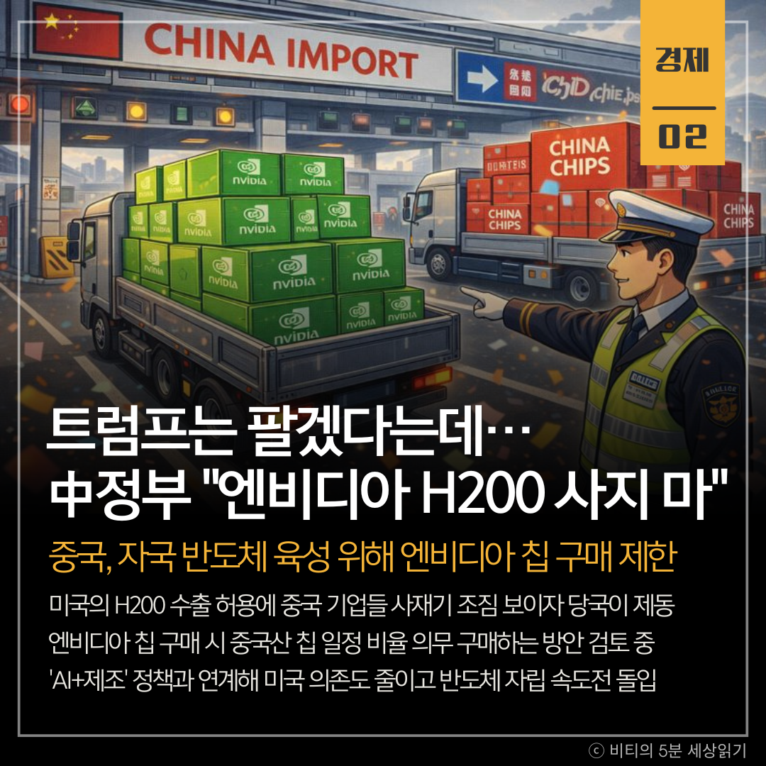 중국 정부가 자국 반도체 생태계 보호를 위해 기업들에게 엔비디아의 최신 AI 칩인 'H200' 구매를 잠정 보류하라고 지시했습니다. 미국이 수출 빗장을 풀자마자 과열 조짐을 보이는 '사재기'를 막고, 수입산 구매 시 자국산 칩도 의무적으로 사게 하는 '끼워팔기' 정책 도입을 검토 중입니다.
