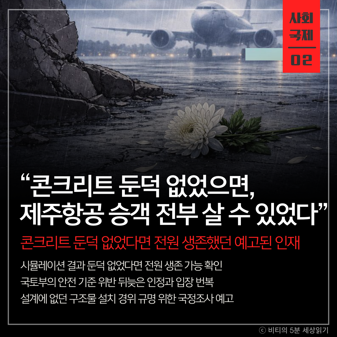 12.29 제주항공 여객기 참사 조사 결과, 활주로 끝에 설치된 콘크리트 둔덕이 없었다면 탑승객 전원이 생존했을 것이라는 시뮬레이션 분석이 나왔습니다. 국토부도 해당 시설물이 안전 기준을 위반했음을 뒤늦게 인정했습니다.