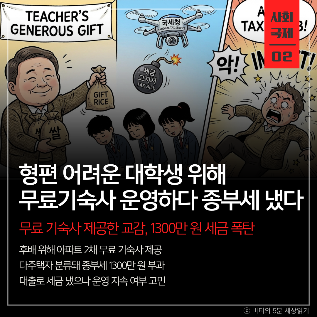 가정형편이 어려운 후배들에게 아파트 2채를 무료 기숙사를 제공하던 현직 교감이, 다주택자로 분류돼 1,300만 원의 종부세 폭탄을 맞아 안타까움을 사고 있습니다.