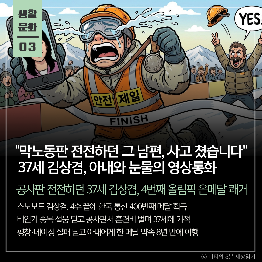 "여보, 나 약속 지켰어." 이 한마디에 담긴 8년의 무게를 감히 짐작할 수 있을까요. 화려한 올림픽 무대 뒤에는 차가운 공사판에서 벽돌을 나르며 꿈을 지킨 가장의 땀방울이 있었습니다. 포기하지 않는 자에게 기적은 반드시 온다는 사실을, 37세의 김상겸 선수가 온몸으로 증명했습니다.