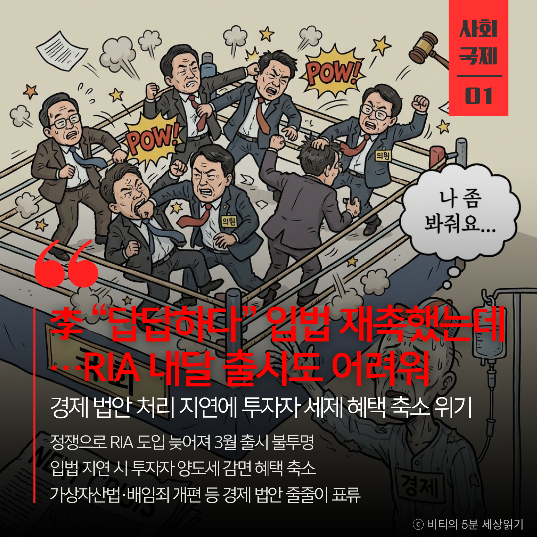여야 정쟁으로 '국내 복귀 계좌(RIA)' 등 주요 경제 법안 처리가 지연되면서, 투자자 세제 혜택 축소와 기업 경영 불확실성이 우려되는 상황입니다.