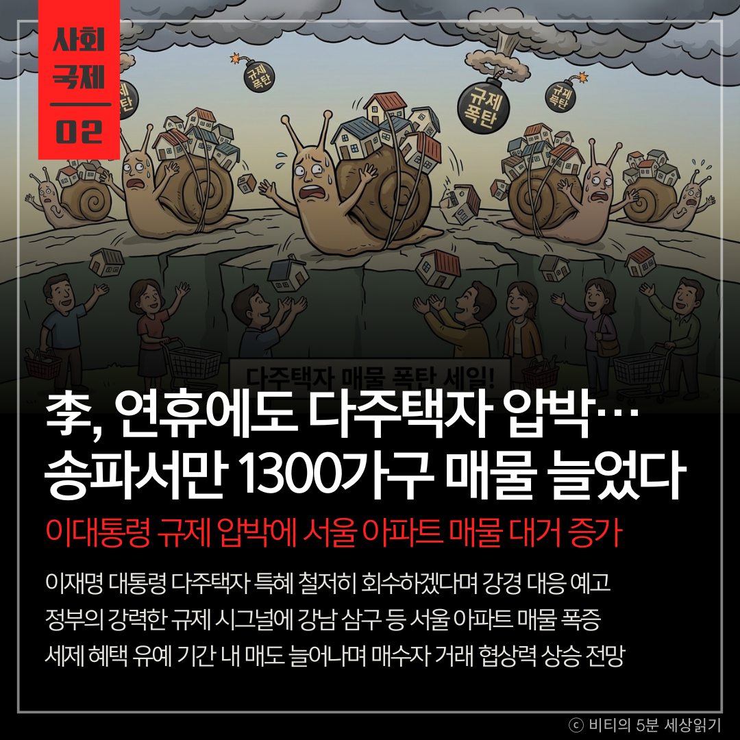 이재명 대통령은 설 연휴에도 다주택자의 혜택 회수와 엄벌 의지를 보이며 강한 압박을 이어갔습니다. 더 이상의 '봐주기'는 없다는 강력한 시그널에 다주택자들이 유예 기간 내 처분에 나서면서, 서울 아파트 매물이 지난해 말 대비 10.6% 증가했고 특히 송파구는 40% 가까이 매물이 폭증했습니다.