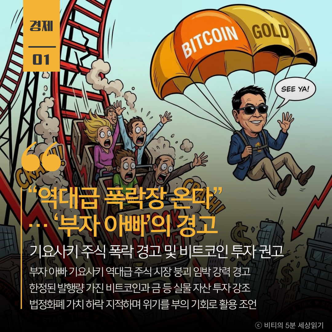 '부자 아빠 가난한 아빠'의 저자 로버트 기요사키가 주식 시장의 거대한 붕괴가 임박했다고 경고하며, 비트코인과 금 등 대체 자산으로 대비할 것을 강력히 촉구했습니다.