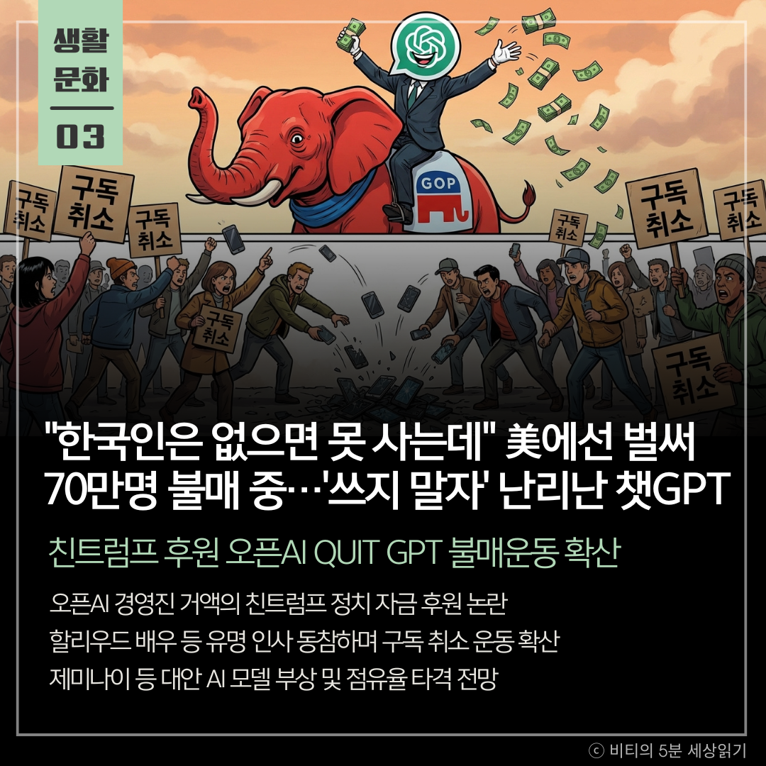 최근 미국에서 인공지능(AI) 챗봇 '챗GPT'의 유료 구독을 취소하자는 '큇GPT'(QuitGPT) 운동이 확산하고 있다. 이는 챗GPT를 개발한 오픈AI 경영진이 도널드 트럼...