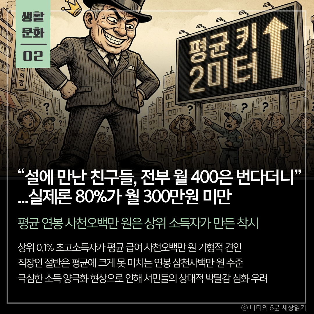 전문가들은 상위 20%를 제외한 하위 80%의 평균 연봉이 3000만 원 안팎에 머무는 극심한 소득 양극화 현실을 지적하며, 단순한 평균값의 상승이 서민들의 삶의 질 개선을 의미하지 않고 오히려 상대적 박탈감을 키우고 있다고 경고했습니다.