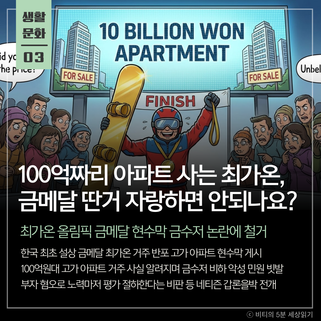 한국 설상 종목 최초로 올림픽 금메달을 딴 최가온 선수의 거주지인 반포 고가 아파트에 걸렸던 축하 현수막이 '금수저' 논란과 악성 민원에 휩싸여 결국 철거되었습니다.