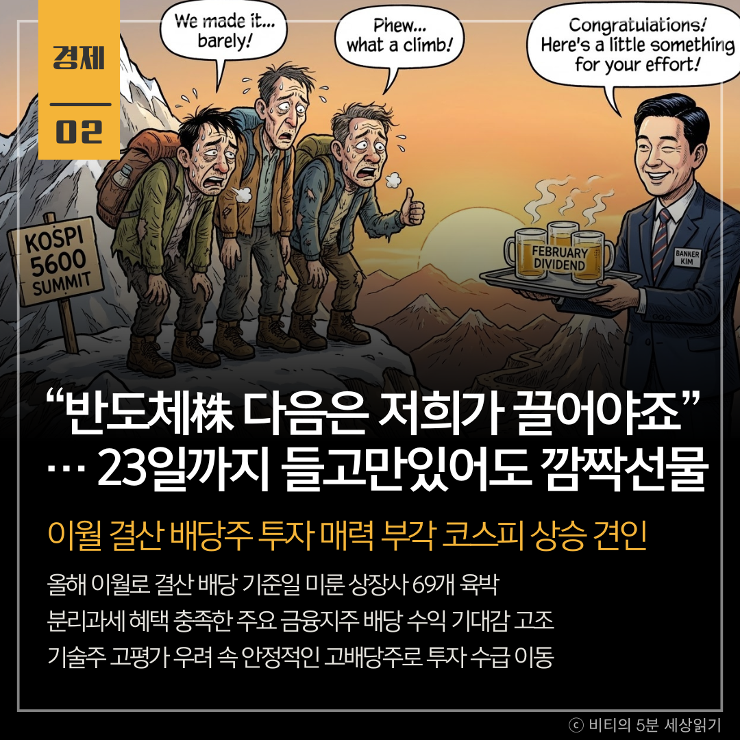 결산배당 기준일이 2월로 변경되고 분리과세 혜택이 맞물리면서, 기술주 고점에 부담을 느낀 시장의 수급이 안정적인 수익을 노릴 수 있는 고배당주로 대거 이동하고 있습니다.