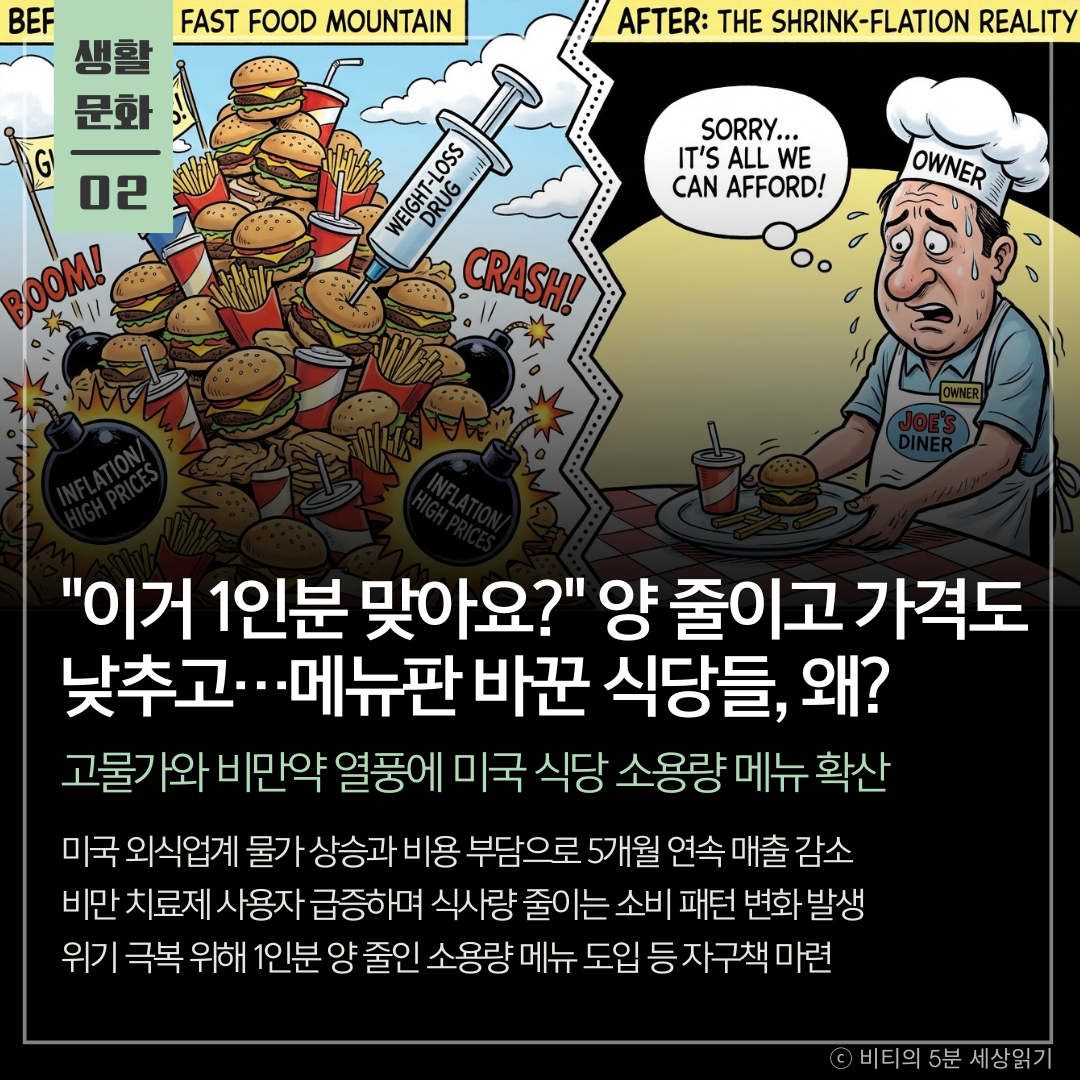 미국 외식업계가 물가 상승으로 인한 비용 압박과 비만 치료제 확산에 따른 소비 패턴 변화에 대응하기 위해 1인분 제공량을 줄인 소용량 메뉴를 속속 도입하고 있습니다.