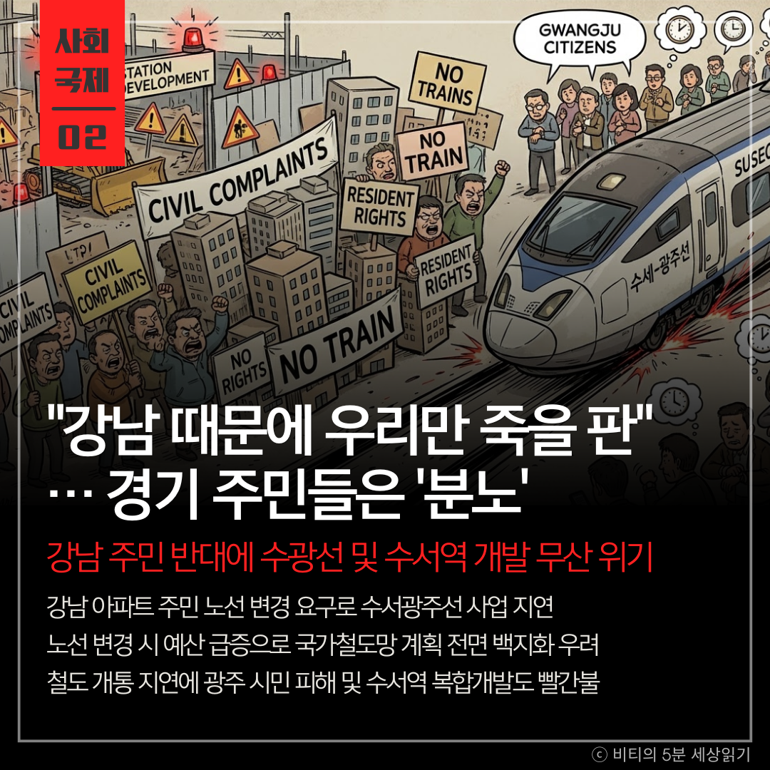 강남구 자곡동 주민들의 노선 변경 요구 민원으로 수서-광주 복선전철(수광선) 사업이 지연되며, 경기 광주 등 지역 주민 피해와 수서역 환승센터 복합개발 차질이 우려됩니다.
