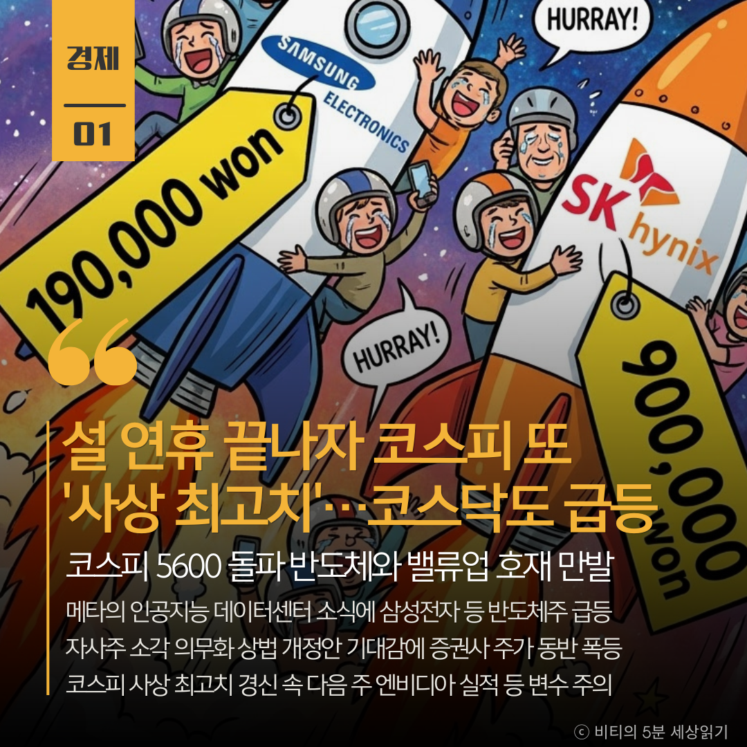 설 연휴 직후 코스피가 사상 처음 5600선을 돌파하고 코스닥은 매수 사이드카가 발동되는 등 인공지능 반도체 호황과 밸류업 정책 기대감에 우리 증시가 폭등했습니다.