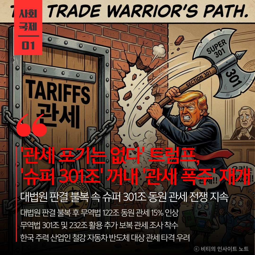 사법부의 제동에도 아랑곳하지 않고 법의 허점을 찾아내 관세 장벽을 쌓는 트럼프 식 정면 돌파임 301조와 232조는 한국 경제의 기둥인 자동차와 반도체를 직접 겨냥할 수 있는 치명적인 무기임 수출로 먹고사는 우리 기업들에게는 그 어느 때보다 가혹한 시련이 닥칠 것으로 보이며 정부 차원의 고도화된 대응 시나리오가 시급함