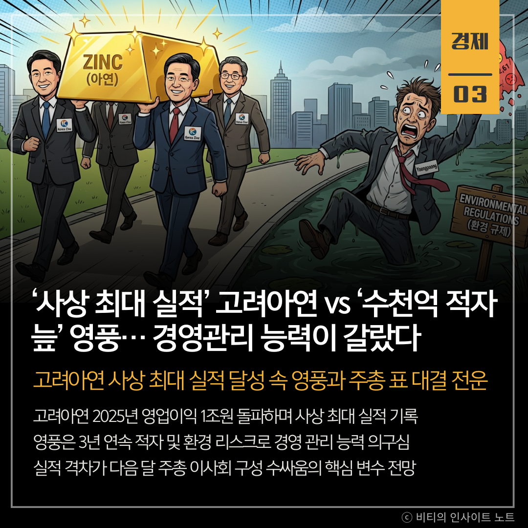 다음 달 고려아연 주주총회를 앞두고 사상 최대 실적을 기록한 현 경영진과 3년 연속 적자에 허덕이는 영풍 MBK 연합 간의 경영 능력 평가가 핵심 쟁점으로 부상함
