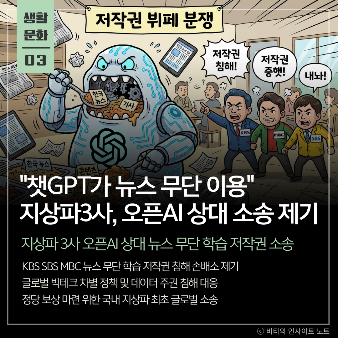 KBS SBS MBC 등 지상파 3사가 오픈AI를 상대로 뉴스 콘텐츠를 무단 활용해 ChatGPT를 학습시킨 것에 대한 저작권 침해 중단 및 손해배상 소송을 제기함