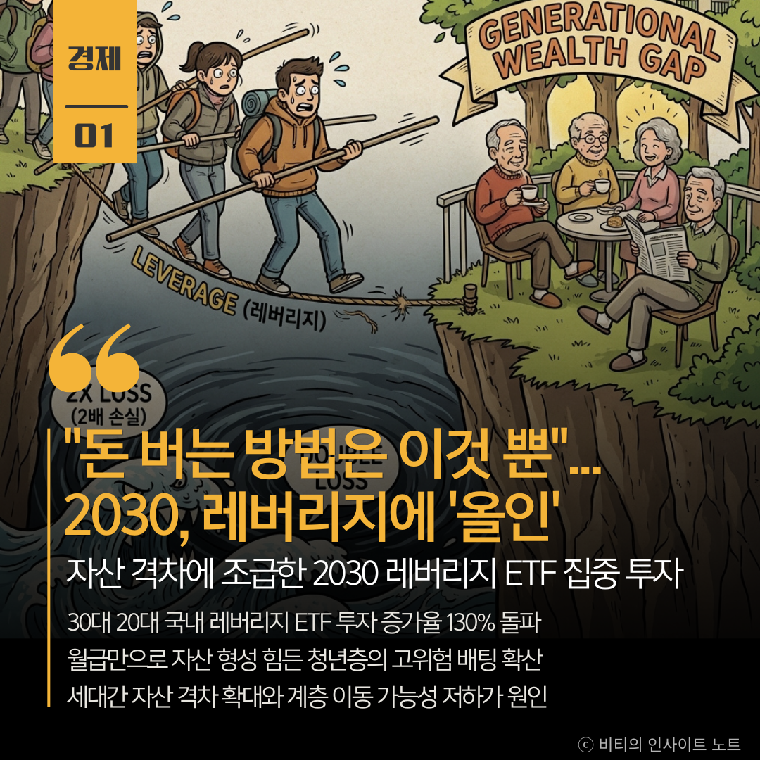조예별 기자의 보도에 따르면 국내 증권사 세 곳의 자료 분석 결과 1년 전보다 레버리지 ETF 투자를 가장 많이 늘린 층은 30대와 20대임 30대는 KOSPI 20대는 KOSDAQ 레버리지 투자를 선호하며 이는 근로 소득만으로는 자산 형성이 어렵다는 청년층의 절박함이 투영된 결과임