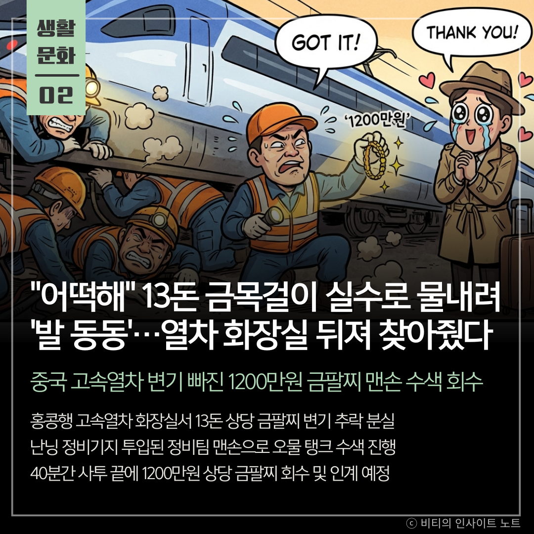 오물 탱크 속에서 1200만원을 건져 올린 정비팀의 직업 정신이 빛난 사건임 기계로 하기 힘든 정밀 수색을 맨손으로 해낸 끈기가 놀라움 잃어버린 금팔찌보다 더 빛나는 건 승객의 자산을 끝까지 지키려 한 노동의 가치임