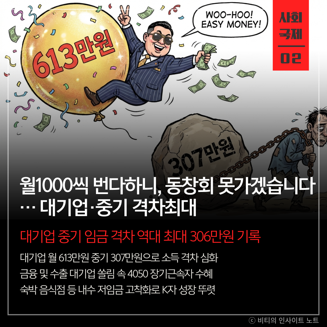 2024년 대기업 월평균 소득이 사상 처음 600만원을 돌파한 반면 중소기업은 그 절반 수준에 머물며 두 기업군 간 임금 격차가 역대 가장 큰 폭으로 벌어짐