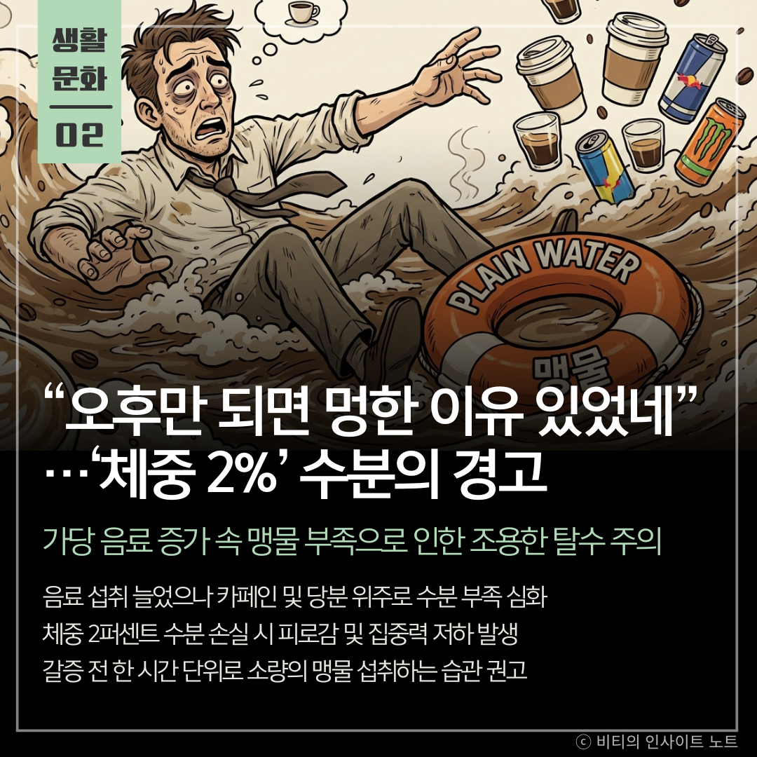 커피를 물처럼 들이켜는 현대인들에게 맹물 한 잔의 가치를 일깨워주는 경고임 오후의 멍함이 잠부족이 아닌 2퍼센트의 수분 결핍에서 온다는 사실이 인상적임 탕비실로 향할 때 커피 믹스 대신 정수기 버튼을 누르는 작은 습관이 일상의 선명도를 높이는 가장 쉬운 방법임