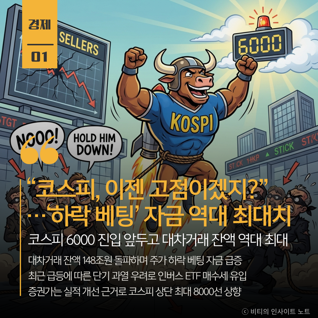 지수 6000이라는 미지의 영역을 앞두고 공포와 탐욕이 정면충돌하는 양상임 급등에 따른 차익 실현 욕구와 하락 베팅이 거세지만 글로벌 금융사들이 제시한 8000선 목표치는 한국 증시의 근본적인 체질 개선을 시사함 단기 변동성은 피할 수 없겠으나 실적이 뒷받침되는 강세장의 힘이 하락 베팅 세력을 압도할지 귀추가 주목됨