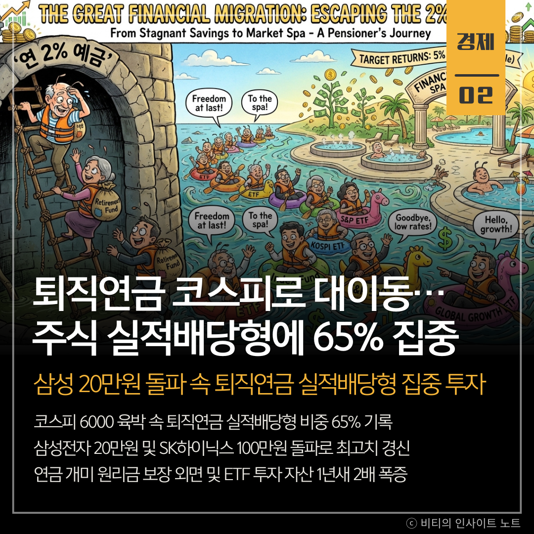 코스피 6000선 진입을 앞두고 삼성전자 20만원 및 SK하이닉스 100만원 돌파와 함께 퇴직연금 자금이 실적배당형 상품으로 급속히 이동함