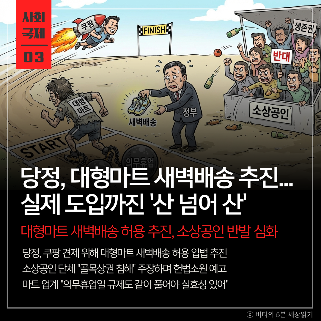 하지만 소상공인연합회 등은 "골목상권 보호 취지가 무색해진다"며 헌법소원 등 강력한 투쟁을 예고했습니다. 반면 대형마트 업계는 "새벽배송의 핵심은 매일 장보기인데, 월 2회 의무휴업일이 유지되면 효과가 반감된다"며 휴업일 규제도 함께 폐지해야 한다고 맞서고 있습니다.