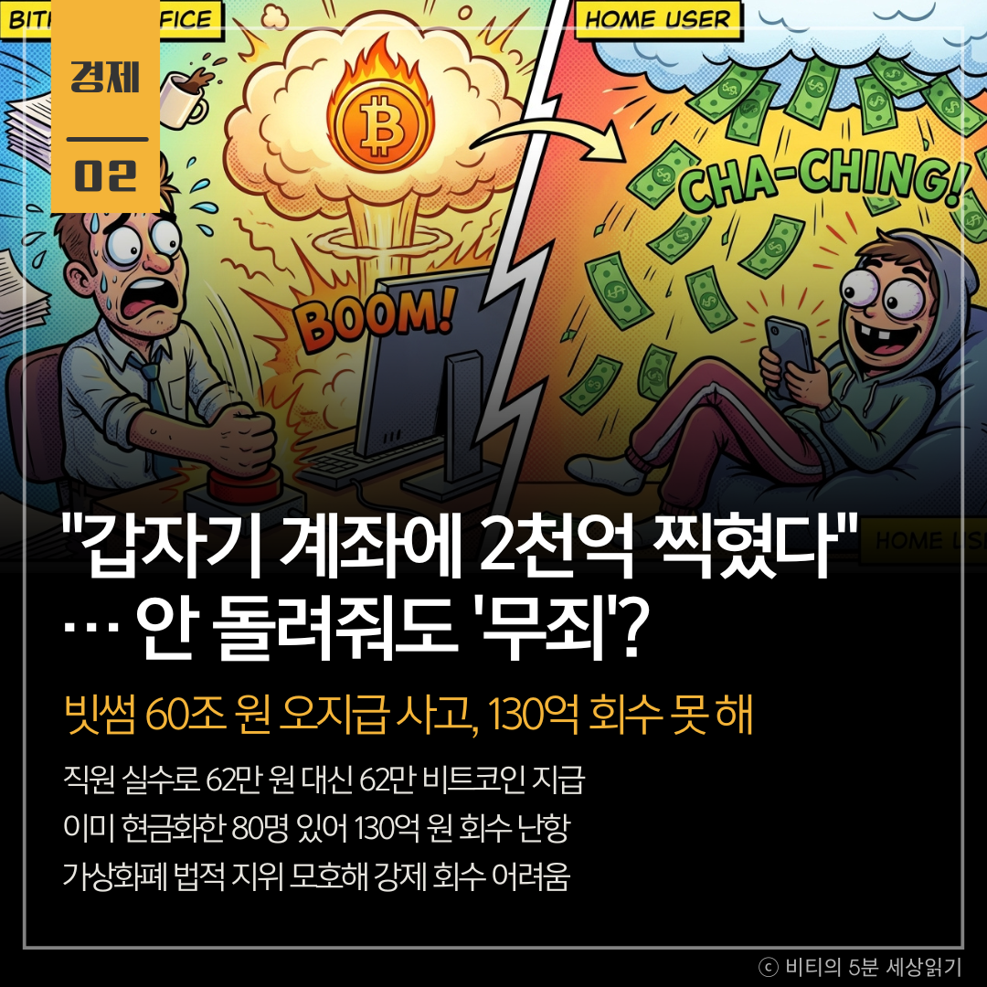 손가락 실수 하나에 60조 원이 생겨났다 사라졌습니다. "내 통장에 2천억이 들어왔다"면 안 빼고 배길 사람이 몇이나 될까요? 도덕적 해이를 탓하기 전에, 휴먼 에러 한 번에 회사가 휘청거릴 만큼 뻥튀기 지급이 가능한 거래소의 허술한 시스템이 더 충격적입니다.