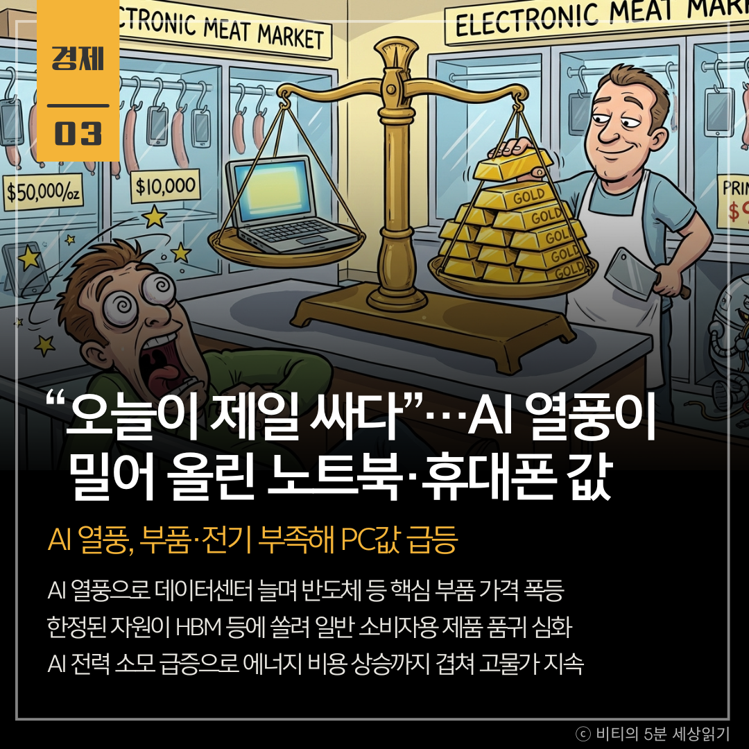 AI 열풍으로 데이터센터 건설이 급증하면서 반도체 등 핵심 부품 품귀 현상이 심화, PC와 노트북 등 전자기기 가격이 급등하고 있습니다.