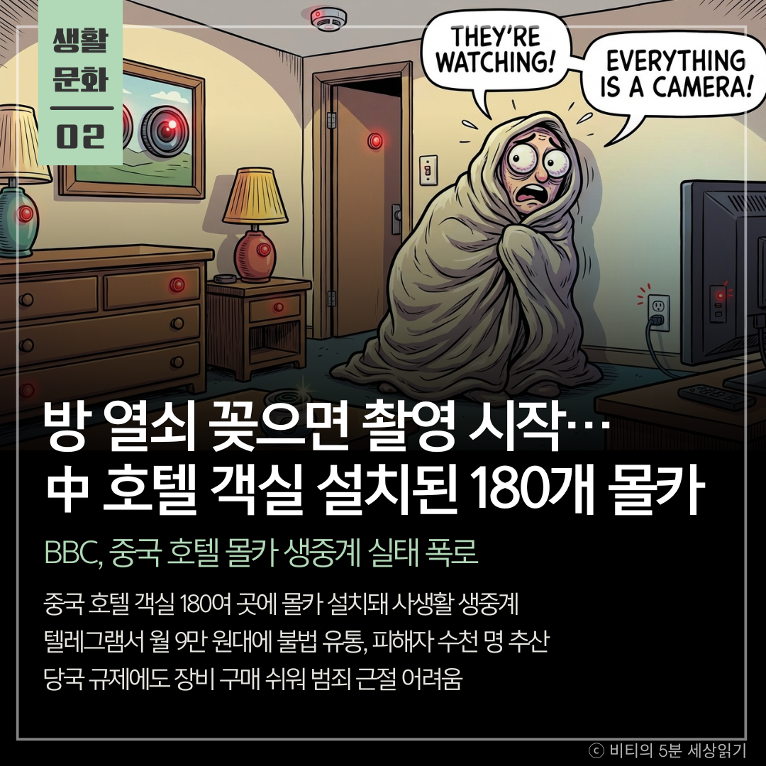 여행지에서 편안히 쉬어야 할 호텔방이 '트루먼 쇼' 세트장이 되어버렸습니다. 녹화도 모자라 실시간 생중계라니, 피해자는 자신이 찍히는 줄도 모르고 전 세계의 구경거리가 되는 셈입니다. 중국 여행을 계획 중이라면, "설마 내가?" 하는 생각보다는 환풍구나 콘센트를 꼼꼼히 살피는 '의심'이 나의 사생활을 지키는 유일한 방법일지 모릅니다.