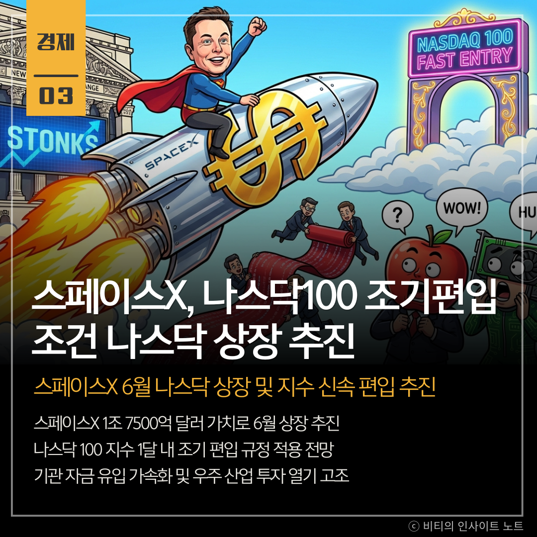 나스닥 100 지수 편입은 풍부한 유동성 확보와 주주 기반 확대 측면에서 큰 의미를 가집니다. 스페이스X 외에도 앤트로픽과 오픈AI 등 인공지능 분야의 거물급 기업들이 올해 기업공개를 준비하고 있어 하반기 미국 기업공개 시장의 열기가 뜨거워질 전망입니다.