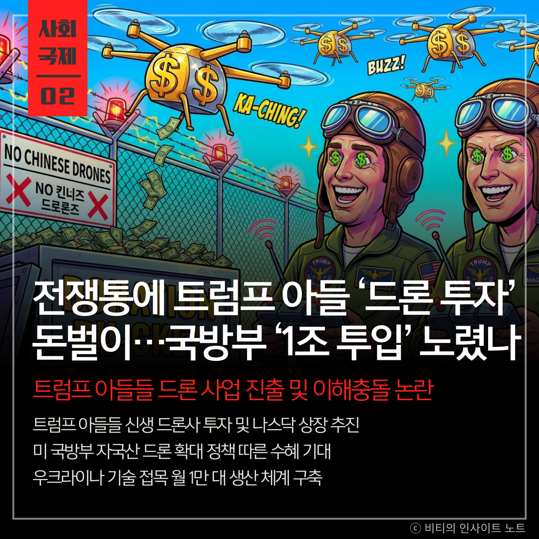정치적 권력과 비즈니스를 결합하는 트럼프 가문 특유의 행보가 첨단 방산 분야로 확장된 사례입니다. 자국 우선주의와 안보 강화라는 국정 기조가 대통령 일가의 사익 편취로 이어질 수 있다는 점에서 심각한 이해충돌 논란이 불가피합니다. 특히 우크라이나와 이스라엘 등 분쟁 지역의 기술을 미 국방부 조달 시장으로 연결하는 가교 역할을 자처하며 독점적 이익을 노리는 시도로 보입니다.
