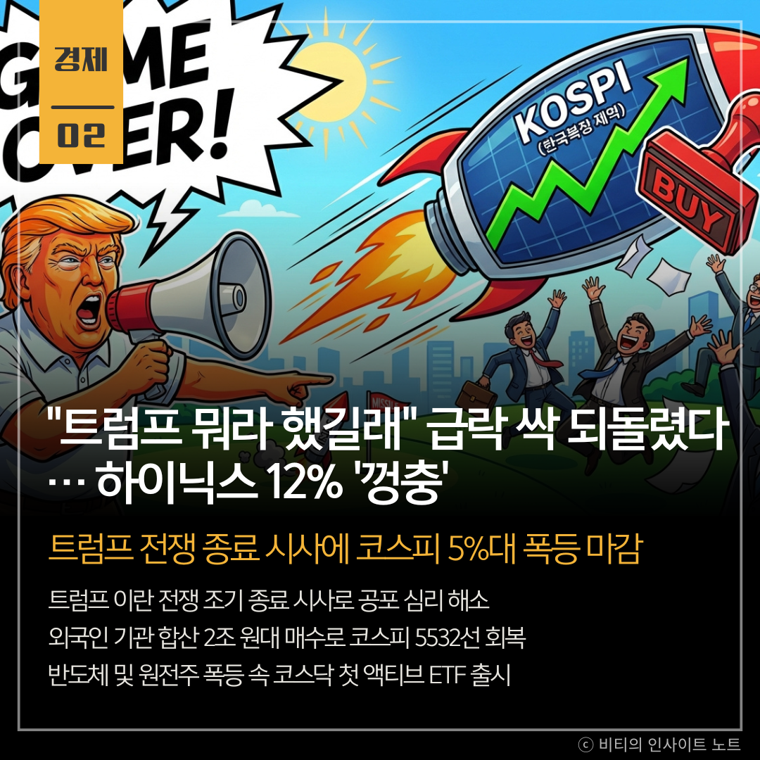 어제는 공포의 하락장이더니 오늘은 기적 같은 반등이 일어난 롤러코스터 같은 하루입니다. 트럼프 대통령의 말 한마디에 냉탕과 온탕을 오가는 시장을 보니 지정학적 리스크의 위력을 다시금 실감하게 됩니다. 다만 전쟁이 완전히 끝난 것은 아니므로 일시적 반등에 안주하기보다 여전히 신중한 대응이 필요합니다.