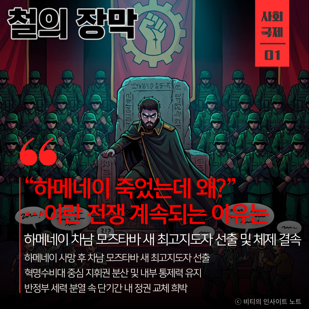 아야톨라 알리 하메네이 사망 후 차남 모즈타바가 새 최고지도자로 선출되었으며 혁명수비대를 중심으로 한 신정 체제는 외부 공격에도 공고히 유지되고 있습니다.