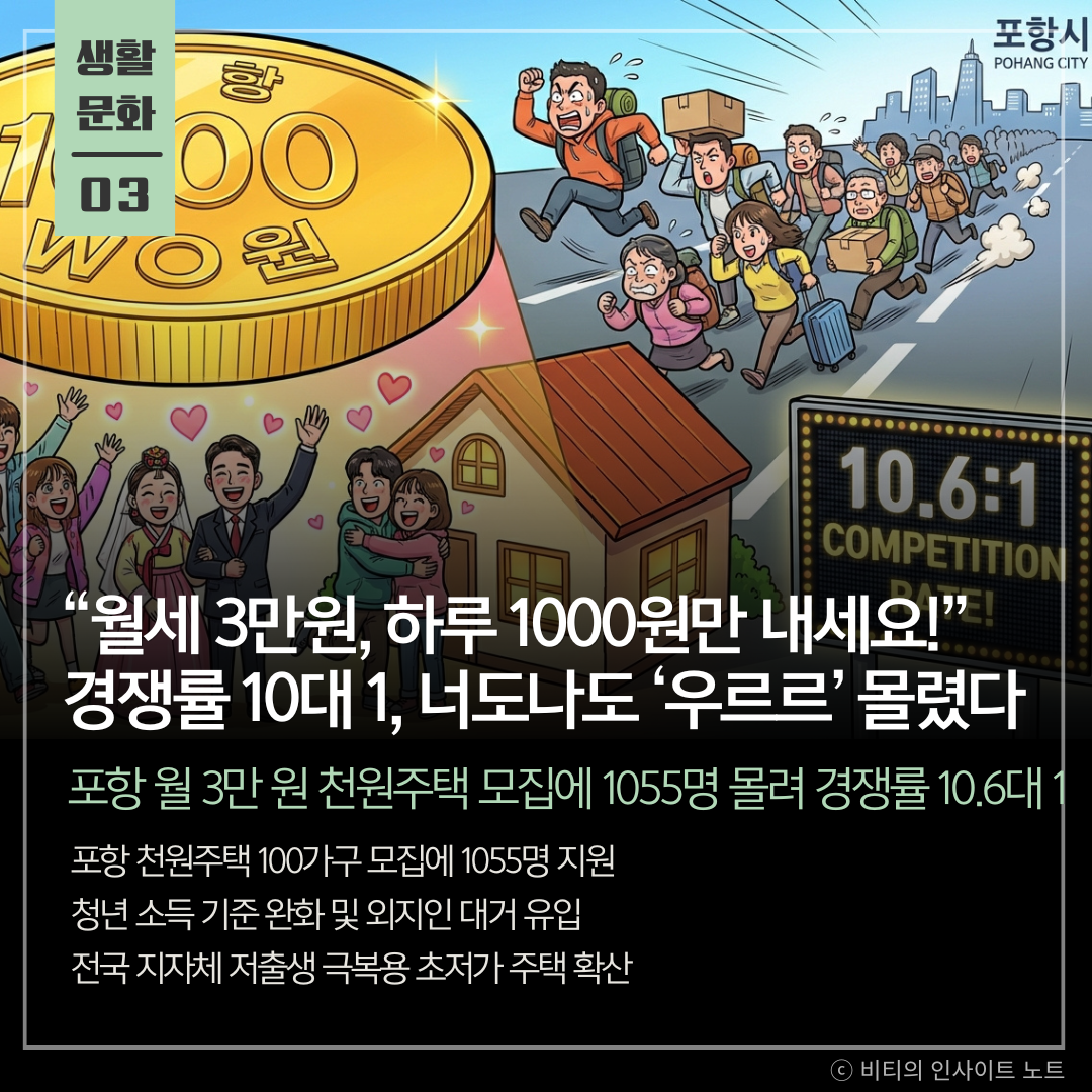 포항시가 공급하는 월 3만 원 임대료의 천원주택 예비 입주자 모집에 1055명이 몰리며 10.6대 1의 높은 경쟁률을 기록했습니다. 청년과 신혼부부의 주거 부담을 파격적으로 낮춘 정책이 타지역 거주자까지 끌어들이며 큰 호응을 얻고 있습니다.