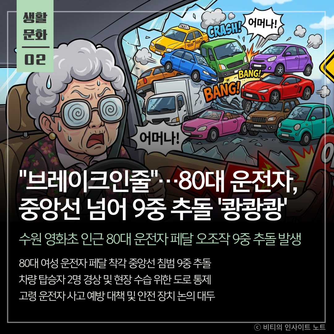 고령 운전자의 페달 오조작 사고가 반복되고 있어 안타까운 상황입니다. 중상자가 없어서 천만다행이지만 도심 한복판 9중 추돌은 자칫 대형 참사로 이어질 수 있었던 아찔한 순간이었습니다. 고령화 시대에 맞춰 운전면허 반납 지원책이나 페달 오조작 방지 장치 의무화 등 실질적인 사고 예방 대책에 대한 사회적 논의가 더욱 속도를 내야 할 시점입니다.