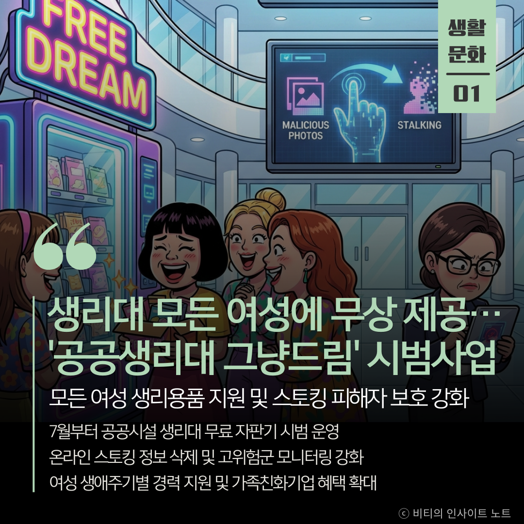 성평등가족부는 10일 열린 국무회의에서 이러한 내용의 생리용품 지원 확대 방안을 보고했습니다. 올해 7월부터 12월까지 생리대가 필요한 모든 여성에게 생리용품을 무상으로 제공하는 가칭 공공생리대 드림 시범사업을 추진할 예정입니다. 공공시설에 무료 자판기를 비치해 직접 지원하며 예산은 국비 30억 원 규모입니다. 기존 9~24세 취약계층 청소년 대상 월 14000원 상당의 바우처 지원도 지속합니다.