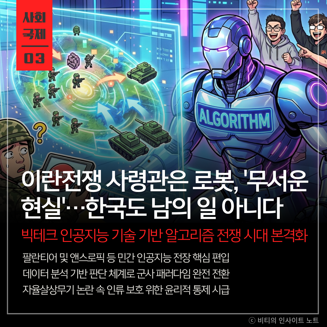 인공지능이 실전 전장에서 표적 식별과 작전 결정을 주도하며 데이터 중심의 알고리즘 전쟁 시대가 본격 개막함에 따라 실리콘밸리 빅테크의 군사적 영향력이 극대화되고 윤리적 통제 논쟁이 재점화 되었습니다.