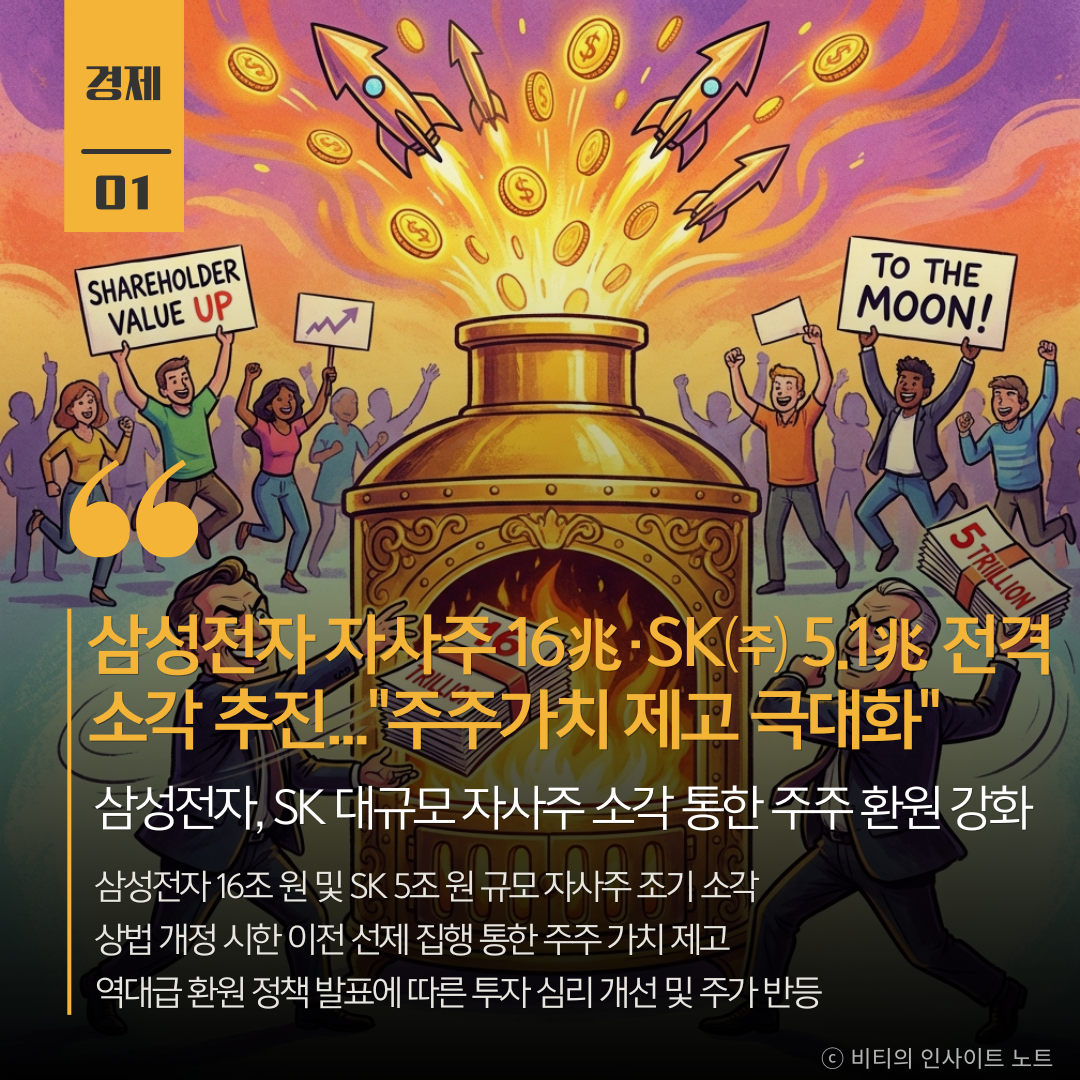 삼성전자와 SK그룹 지주사가 주주 가치 제고를 위해 총 21조 원 규모의 자기주식을 조기 소각하기로 결정했습니다.