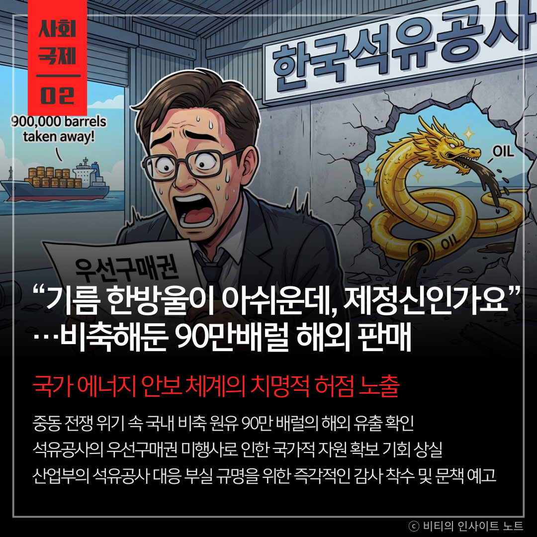 전쟁터에서 실탄을 창고에 쌓아두고도 정작 필요할 때 남에게 넘겨준 꼴이라 참으로 씁쓸합니다. 설마 진짜 전쟁이 나겠어라는 안일함이 부른 행정 공백은 아닐까요? 에너지 자립도가 낮은 우리나라에게 원유는 곧 생명줄과 같습니다. 이번 감사를 통해 단순히 누구의 잘못인지를 따지는 것을 넘어, 국가 자원 안보 시스템 전반에 구멍이 난 곳은 없는지 철저히 점검해야 할 때입니다.