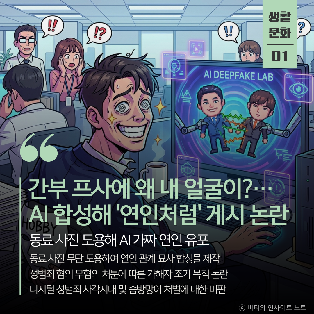 서울 구로구청의 한 공무원이 직장 동료의 사진을 무단으로 사용하여 AI 합성 이미지를 제작하고 SNS에 유포한 사실이 드러났습니다. 가해자 A씨는 구청 조직도에서 동료 B씨의 사진을 내려받아, 두 사람이 다정하게 껴안고 있는 연인 같은 모습의 가짜 사진을 만들었습니다. 심지어 사진에는 피해자의 이름을 연상시키는 문구까지 넣어 오해를 불러일으켰습니다.