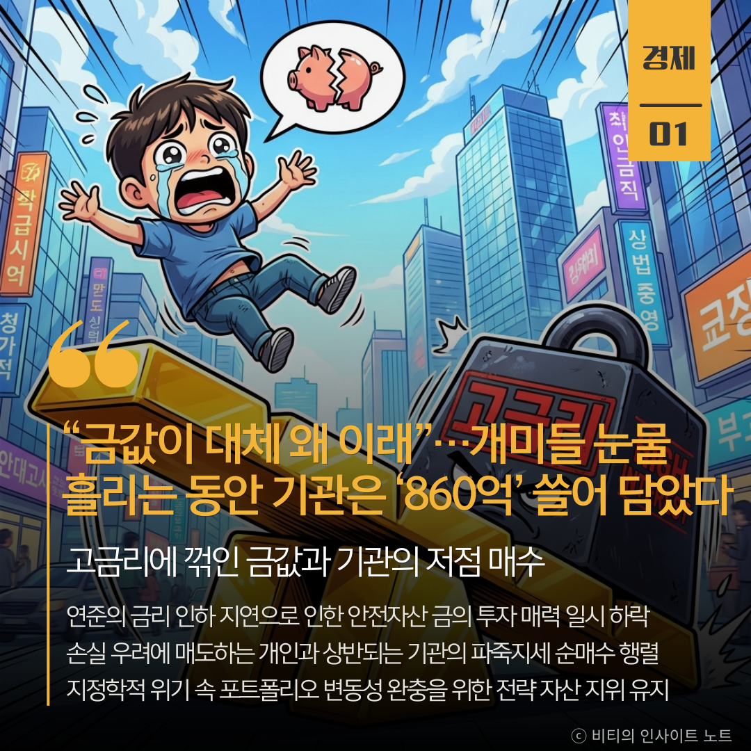 전쟁이 나면 금값이 오른다는 상식이 금리라는 거대한 벽에 부딪힌 형국입니다. 지금의 금값 하락은 자산 가치의 근본적 훼손이라기보다, 금리 인하 시점이 뒤로 밀린 데 따른 일시적인 기회비용 발생으로 보입니다. 개인들이 공포에 질려 매물을 내놓을 때 기관들이 조용히 바구니를 채우는 현상을 주목해야 합니다. 결국 금은 수익을 내는 수단이기 이전에 내 자산을 지키는 최후의 보루라는 점을 잊지 말아야겠습니다.