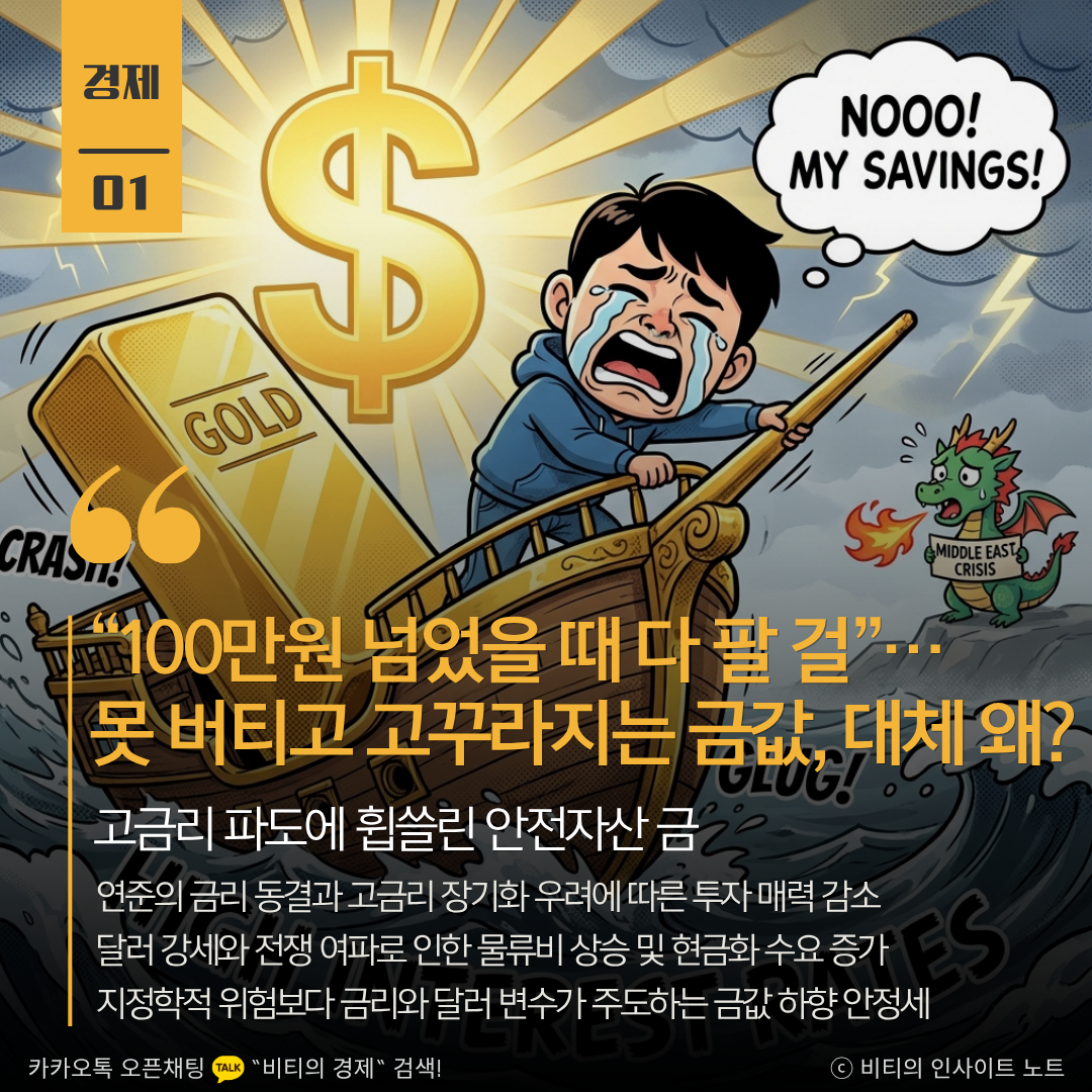 미국과 이란의 전쟁 중에도 금값이 100만 원 아래로 급락했습니다. 안전자산이라는 상식과 달리 고금리 유지와 달러 강세, 그리고 전쟁으로 인한 물류 차질과 현금 확보 수요가 맞물리며 가격을 끌어내린 결과입니다.