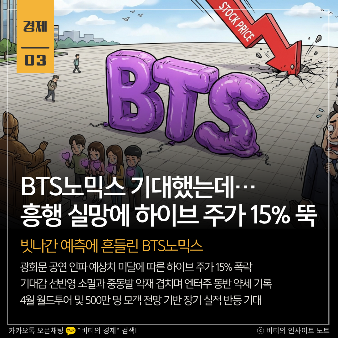이러한 인파 예측 실패는 투자 심리 위축으로 이어져 하이브 주가는 전 거래일 대비 15.55% 하락한 29만 500원에 마감했습니다. 중동 전쟁 여파로 증시 전반이 어두운 가운데, BTS 복귀 호재가 이미 주가에 선반영되었다는 분석까지 나오며 낙폭이 더욱 커진 것으로 풀이됩니다.