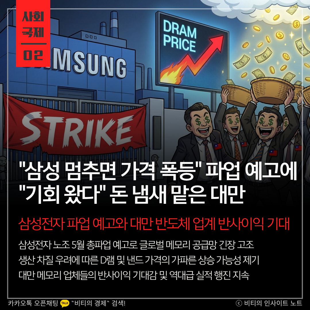삼성전자 노동조합이 오는 5월 창사 이래 2번째 총파업을 예고하면서 글로벌 메모리 반도체 시장이 술렁이고 있습니다. 세계 공급의 40%를 책임지는 삼성의 생산 차질 우려에 대만 반도체 기업들은 가격 폭등에 따른 반사이익을 기대하며 상황을 예의주시하고 있습니다.