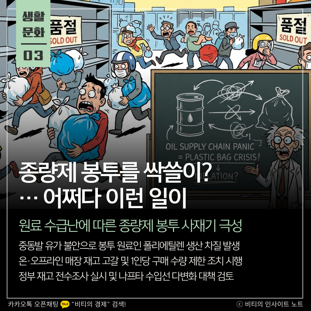 석유화학 제품인 종량제 봉투가 유가 변동의 직격탄을 맞은 것은 우리 일상이 에너지는 물론 원자재 공급망과 얼마나 밀접하게 연결되어 있는지를 단적으로 보여줍니다. 사재기는 단기적인 안도감을 줄 수 있지만, 결국 시장의 왜곡을 심화시켜 꼭 필요한 이웃이 피해를 보게 만듭니다. 정부의 빠른 원료 수급 대책과 더불어 '나 하나쯤이야'가 아닌 '함께 버티는' 공동체 의식이 그 어느 때보다 절실합니다.