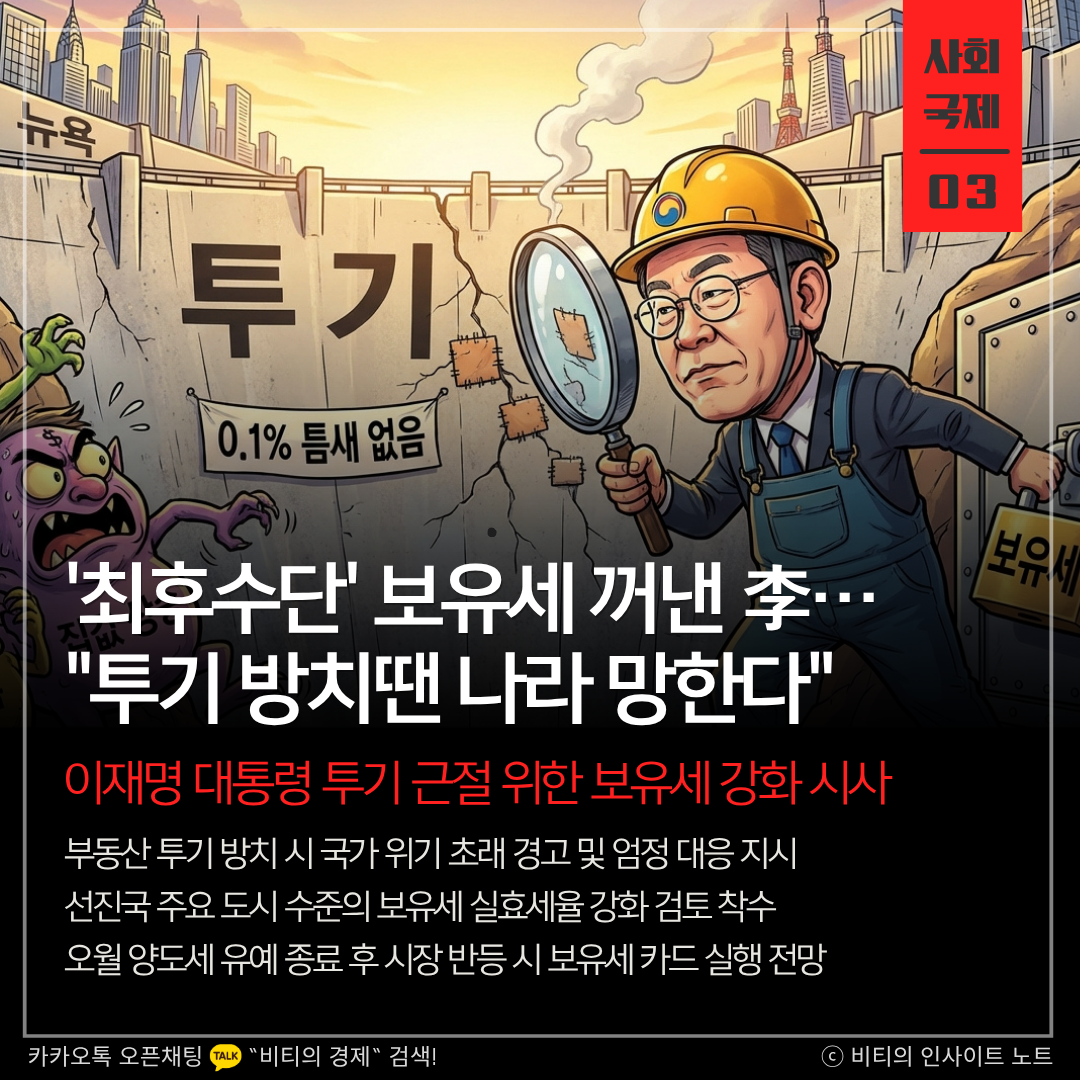 부동산 정책에서 '정치적 고려 배제'를 선언한 것은 시장에 매우 강력한 신호를 보낸 것입니다. 보유세 카드는 주택을 거주 목적이 아닌 자산 증식 수단으로 보는 문화를 뿌리 뽑겠다는 최후통첩과 같습니다. 다만 급격한 세 부담 증가가 실거주자에게 미칠 영향과 국제적 기준 설정의 적절성에 대한 면밀한 검토가 병행되어야 정책의 정당성을 확보할 수 있을 것입니다.