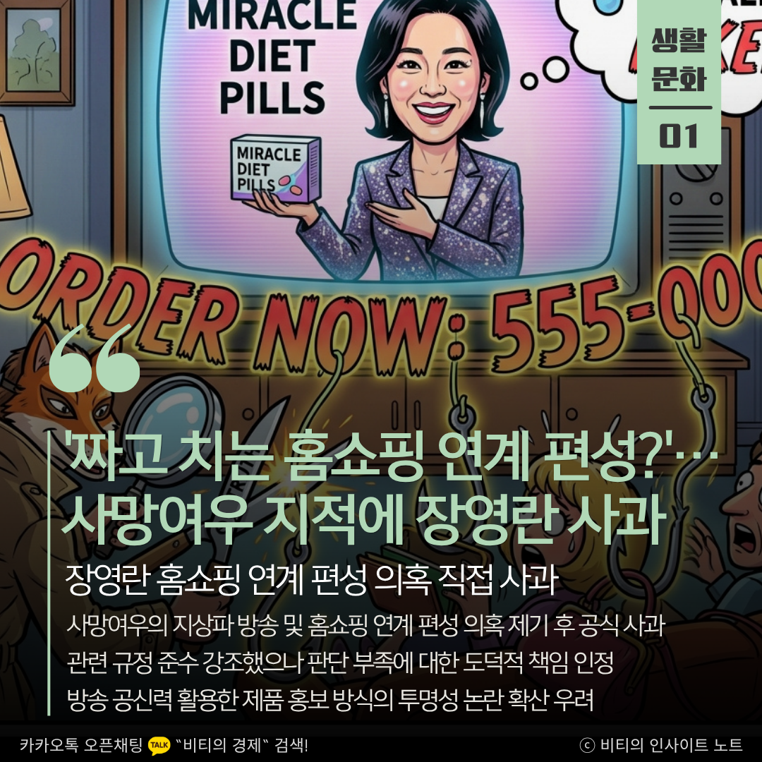 장영란은 24일 자신의 SNS를 통해 최근 불거진 홈쇼핑 연계 편성 의혹에 대해 판단이 부족했다며 고개를 숙였습니다. 이번 논란은 유튜버 사망여우TV가 장영란의 다이어트 제품 브랜드와 지상파 프로그램, 홈쇼핑 편성이 교묘하게 맞물려 있다는 정황을 포착해 폭로하면서 시작되었습니다. 지상파에서 특정 성분으로 체중 감량에 성공한 사례를 방영한 직후, 홈쇼핑에서 장영란이 해당 성분의 제품을 판매하는 방식이 시청자를 기만했다는 지적입니다.