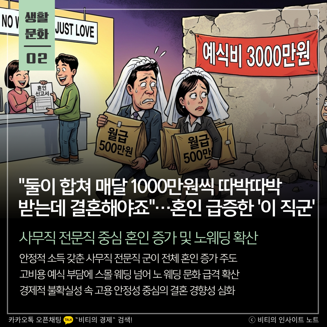 지난해 혼인 건수가 3년 연속 증가한 가운데, 고용과 소득이 안정적인 사무직과 전문직이 이러한 흐름을 주도하고 있습니다. 경제적 불확실성이 커지면서 부부 합산 월 1000만원 수준의 안정적인 수입을 확보한 계층을 중심으로 결혼이 집중되는 경향이 뚜렷해지고 있습니다.