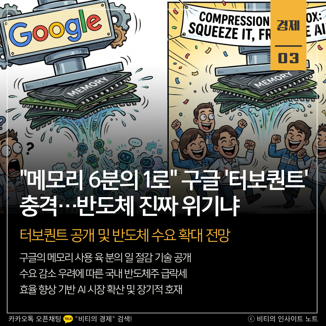 구글 터보퀀트 기술, 메모리 사용 6배↓·처리 속도 8배↑ "AI 에이전트 확장, 메모리 수요↑…삼전·SK하닉 수혜 전망" 구글이 메모리 사용을 획기적으로 줄여 인공지능(AI) 성능을 높이는 '터보퀀