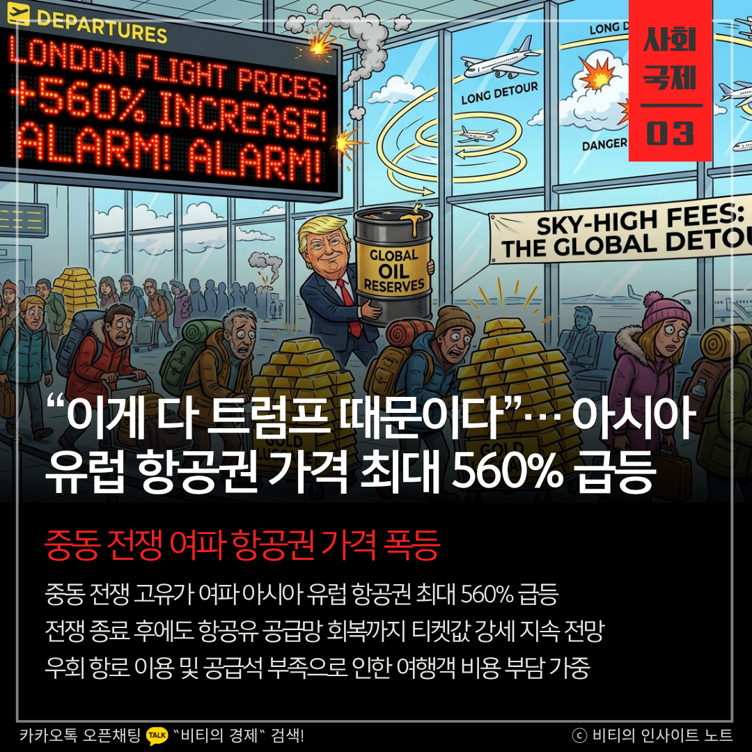 미국과 이란의 전쟁으로 고유가 행진이 이어지면서 아시아와 유럽을 잇는 항공권 가격이 최대 560%나 급등했습니다. 전쟁이 끝나더라도 항공유 공급망 회복에 시간이 걸리는 만큼 당분간 여행객들의 티켓값 부담은 지속될 것으로 보입니다.