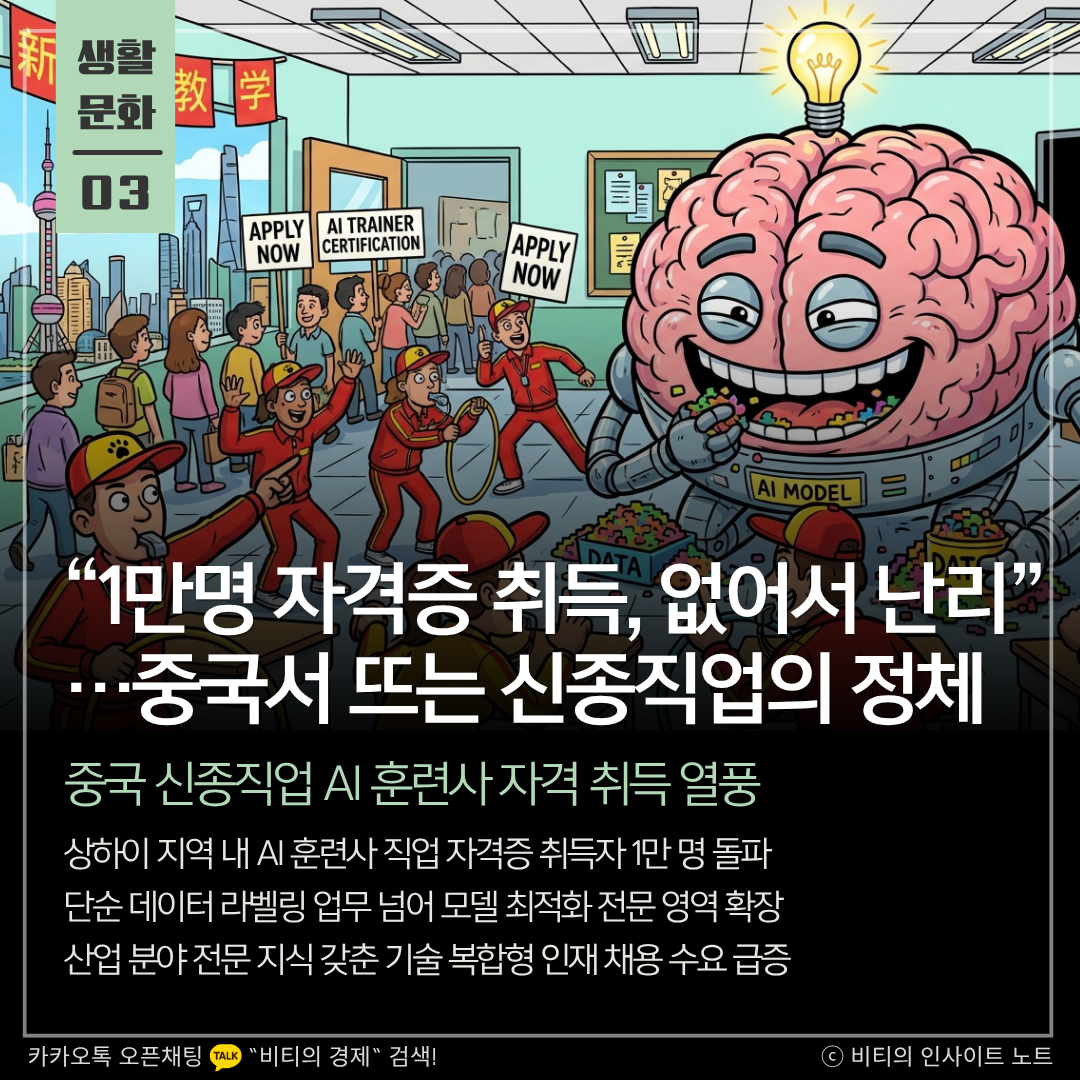 중국 상하이에서 인공지능 제품의 현실 적용을 돕는 신종 직업인 AI 훈련사가 인기입니다. 작년 1만 명 이상 자격증을 취득했고 산업 수요 급증으로 전문 지식을 갖춘 복합형 인재 확보 경쟁이 매우 치열해지고 있습니다.