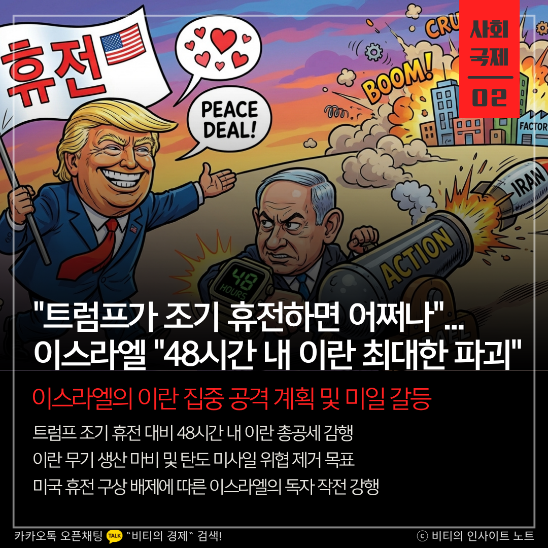 이스라엘이 트럼프 대통령의 조기 휴전 가능성에 대비해 향후 48시간 동안 이란의 무기 시설을 마비시키는 총공세를 계획하고 있습니다. 미국의 휴전 구상에서 배제된 이스라엘은 독자적인 작전으로 핵심 이익을 수호하겠다는 강경한 입장입니다.
